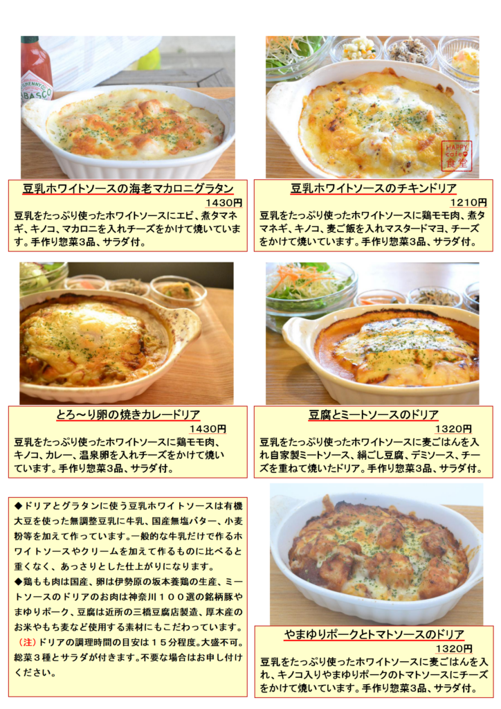 豆乳をベースに牛乳、バターを使い風味を残したホワイトソースがHAPPY cafe 食堂のドリアとグラタンの特徴。このメニューでは隠し味のマスタードマヨネーズが飽きのない味を引き立てます。具材に使う国産鶏もも肉は丁寧に皮、筋や脂肪を取り除き、ソミュール液で味付けをしてから低温調理を施しています。