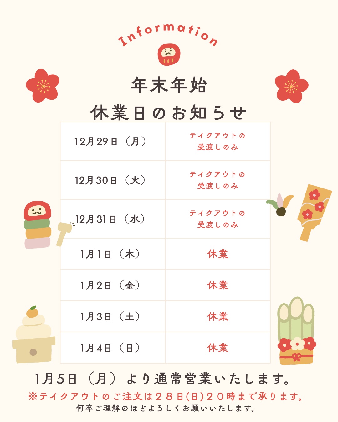 さて、年末年始の営業はイートイン営業は28日で終了となりますが、31日まではテイクアウトの受け渡しのみ対応を続けます。